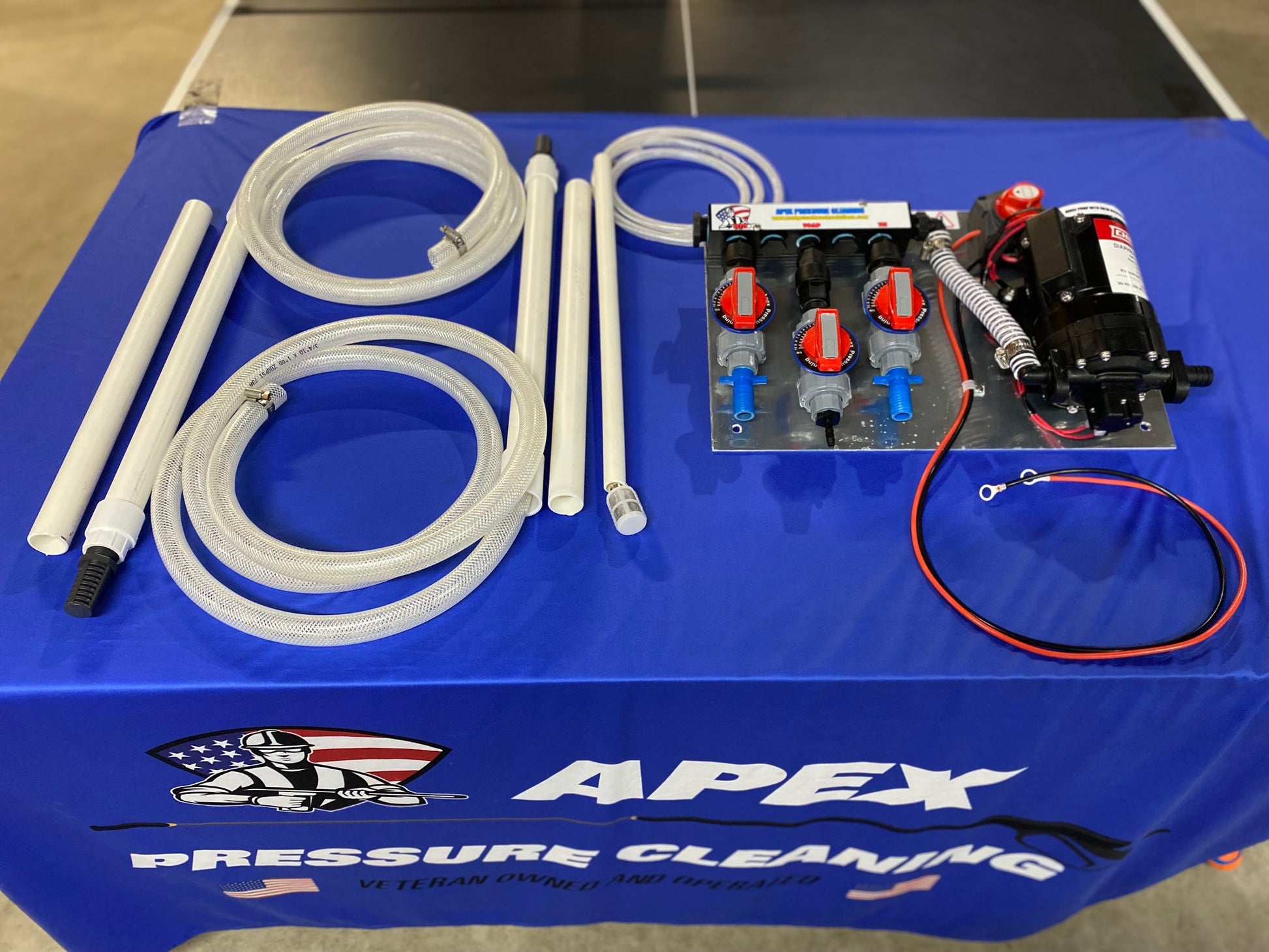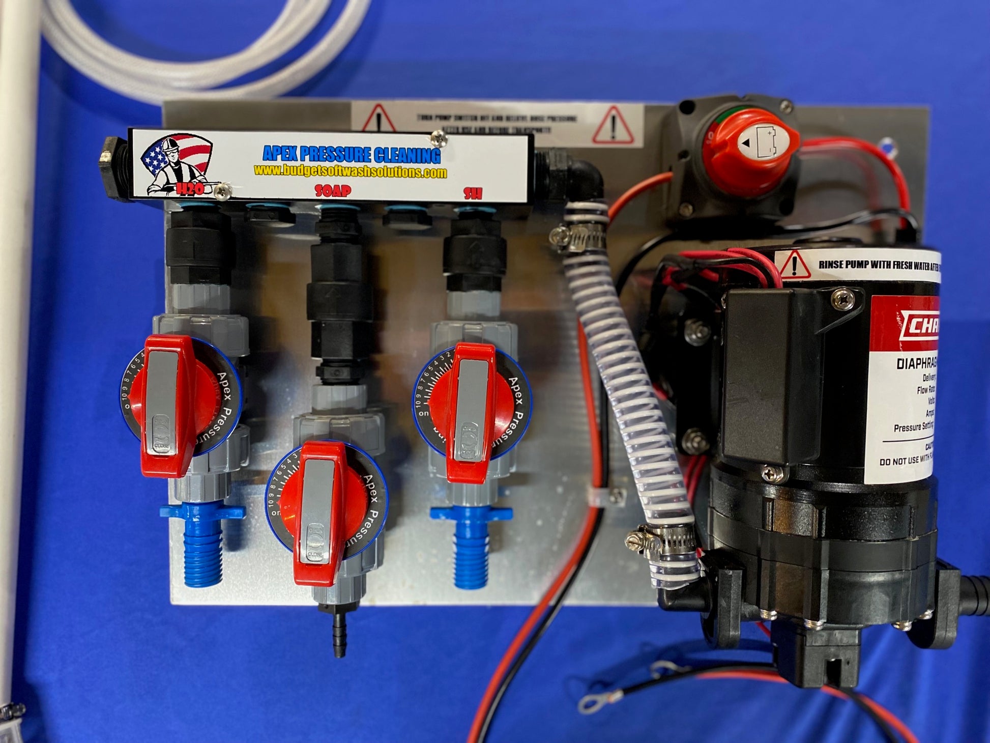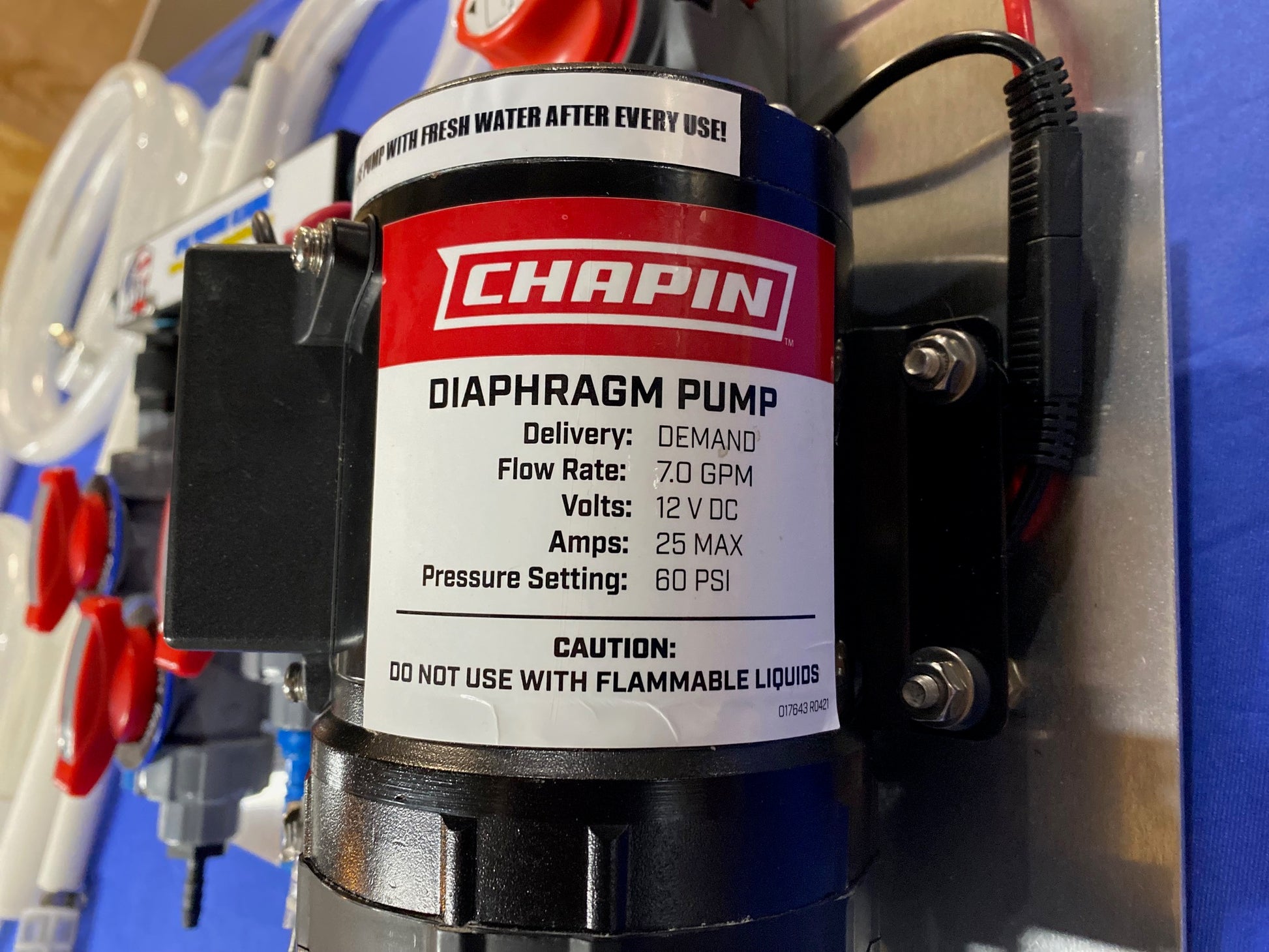 The pump is the Chapin 7.0 gallon per minute, 60 psi 12 volt pump. We used this system primarily for roof washes. It has roughly 8-10 jobs on it and was thoroughly rinsed with fresh water after every use.